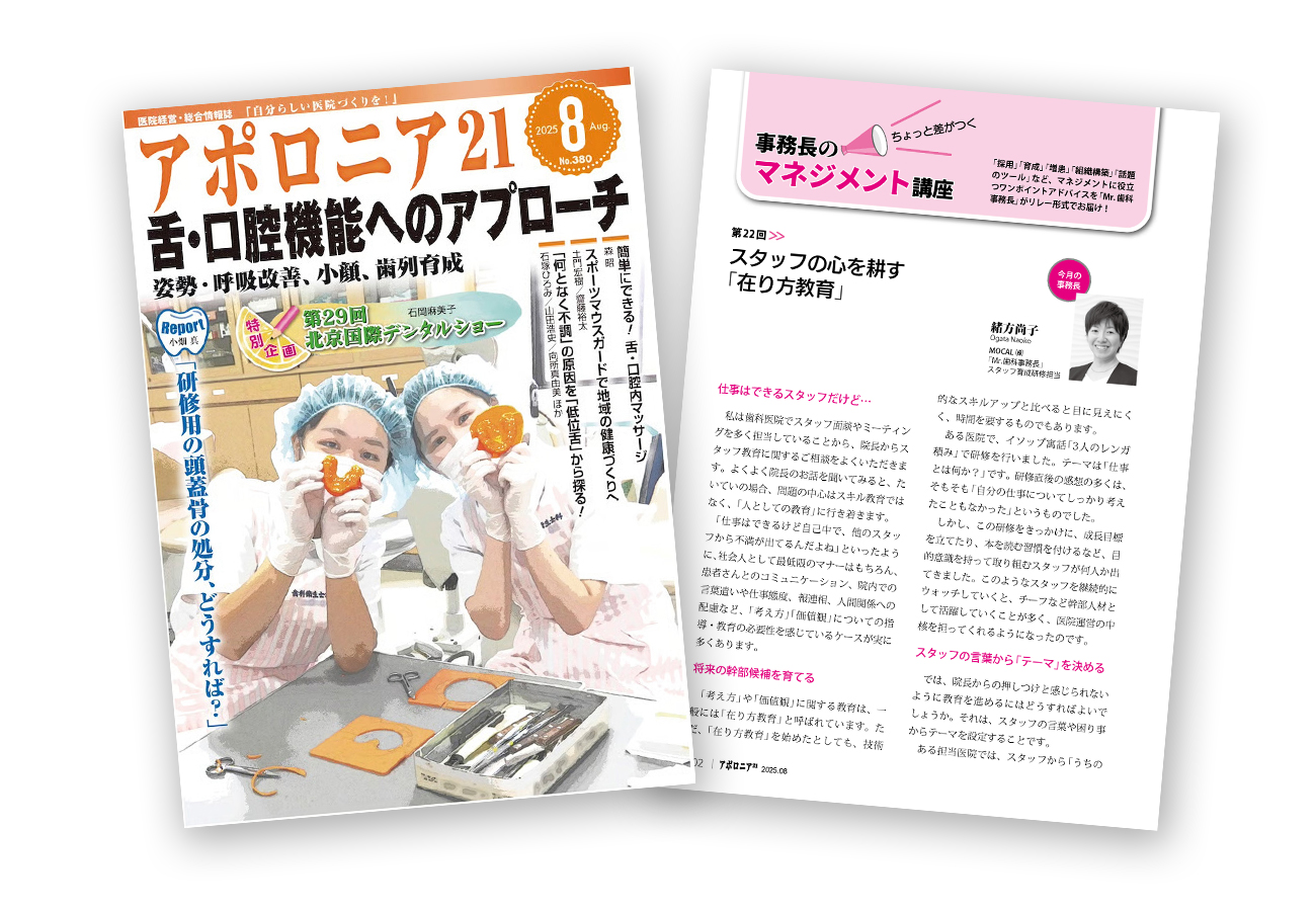 スタッフの言葉からテーマを見つけ、研修や日々の業務の中で自然に意識を変え、将来の幹部候補へと成長させる具体的なヒントを紹介しておりますので、日頃スタッフ教育に悩んでいる院長先生は是非、ご一読ください。